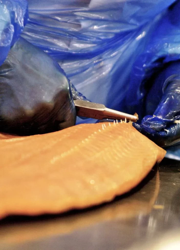 While machine slicing offers speed and uniformity, it lacks the discernment required to truly respect the fish. Machines slice in a fixed, standardised way, unable to recognise when valuable flesh is being wasted or to respond to the natural variations of each fish. By contrast, our expert slicers carefully assess the quality of every salmon — reading the grain, texture, and colour — and adjust their approach accordingly. This human judgement ensures precision, minimises waste, and honours the integrity of the fish in a way no machine ever could.