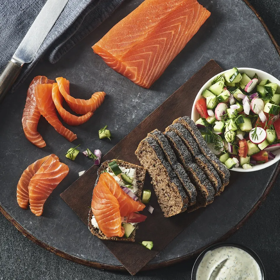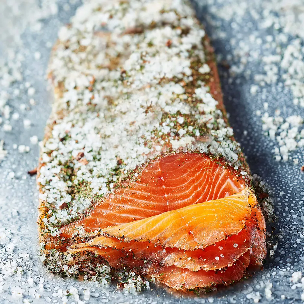 Gravadlax is cured rather than smoked, using a traditional Scandinavian method that gently preserves the fish while enhancing its natural flavour. This time-honoured technique allows the seasoning to shine, creating a delicately balanced, melt-in-the-mouth result.